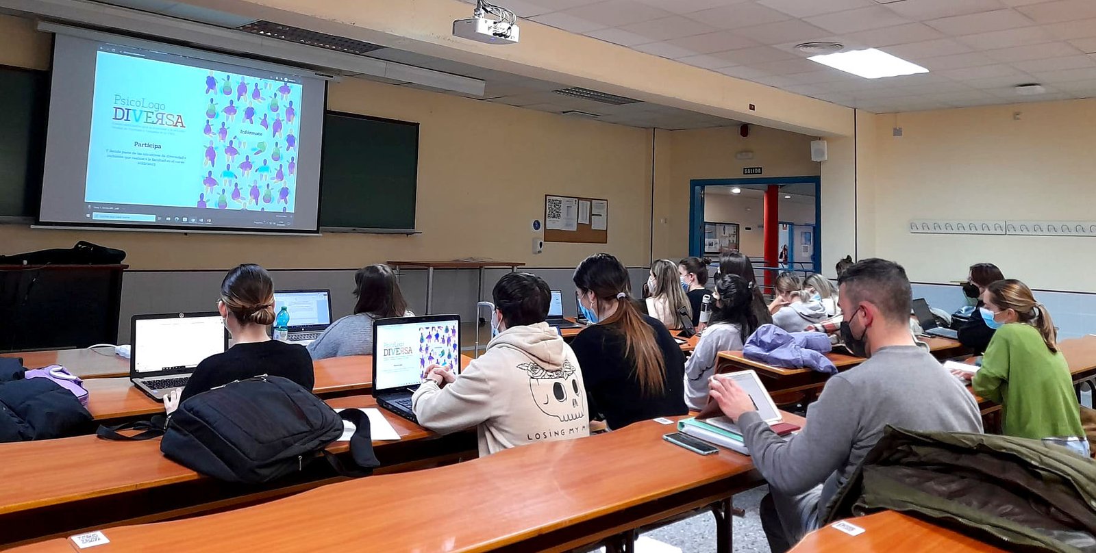 El equipo de dinamización del proceso participativo PsicoLogoDiversa se meten en las aulas de todos los cursos de los Grados de Psicología y Logopedia y de los 3 Máster que acoge la Facultad para dar a conocer el proceso y animar al alumnado a participar en las distintas fases.